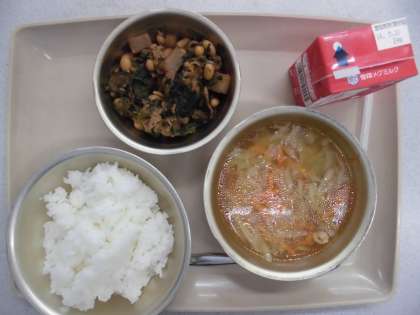 今日の給食の献立は,「ご飯」「キャベツの吉野汁」「牛乳」「肉味噌炒め」です。