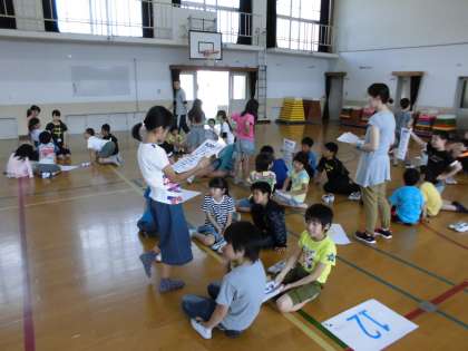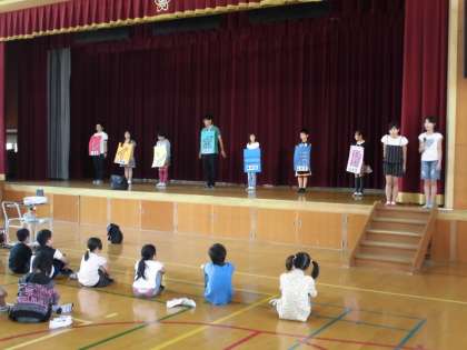 まずは計画委員より,今年度のたてわり活動のネーミングが発表されました。「レインボー活動」になったようです。6つの学年と先生と合わせて7つの力で楽しい活動を作っていくという意味だそうです。(計画委員会で考えました。)