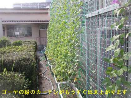 ゴーヤの方は,順調に生育し,カーテンの役目を果たすようになってきました。今月末ぐらい(夏休み)には,隙間もなくなり日陰を作ってくれそうです。
