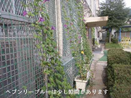 沖縄アサガオ(ヘブンリーブルー)の方は,まだ少し葉が小さく隙間だらけです。またエアコンの室外機が邪魔をしてなかなか横に広がってくれません。カーテンにはもうしばらくかかると思います。