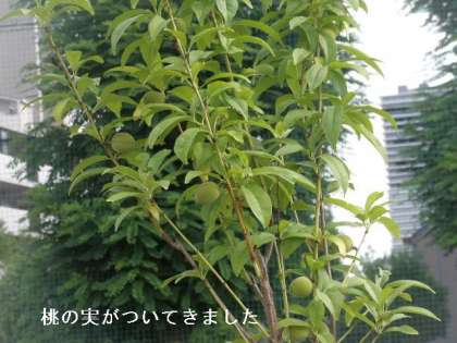 本校ビオトープの築山に記念の木が2本植樹してあります。一つは,今年3月に卒業した前6年生の子どもたちが植えた「旅立ちの木(白桃の木)」です。この夏早くも桃の実がつきました。まだまだ小さく青い実ですが,たくさん結実しています。