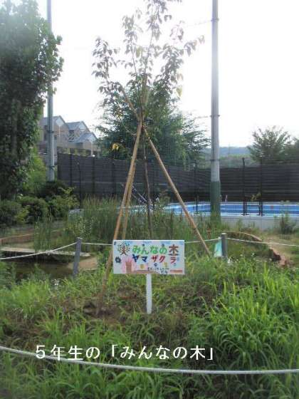 もう一つは,4月に5年生が朝日テレビの「おはよう朝日」に出演して植えた「みんなの木(ヤマザクラ)」です。この木も大きくなり,もう添え木もいらないぐらいにしっかり成長しています。来春にはきれいな桜の花が咲きそうです。