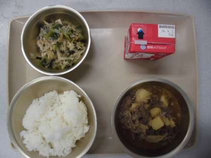 今日の給食の献立は,「ご飯」「肉じゃが」「牛乳」「切干し大根煮つけ」です。