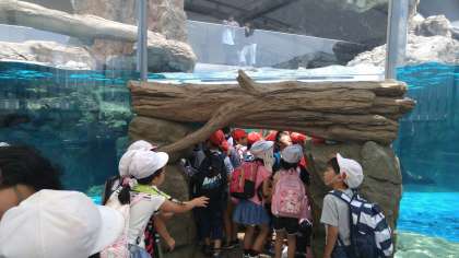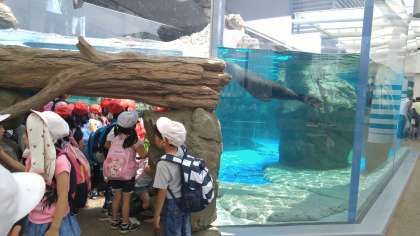 水族館を見学しています。子ども達は,オットセイに夢中になっています。