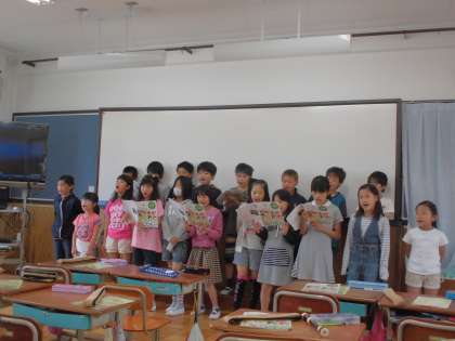 4年生の教室から楽しそうな歌声が聞こえてきました。教室をのぞいてみると,みんなで元気よく「子どもの世界」を歌っていました。