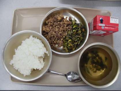 今日の給食の献立は,「ごはん」「ビビンバの具」「わかめスープ」「牛乳」です。