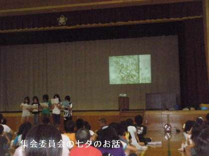次に七夕集会として,音楽クラブがトーンチャイムで七夕のメロディーを演奏してくれました。そして,集会委員会が,七夕のお話を読み聞かせし,最後にみんなで七夕の歌を歌いました。
