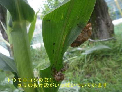 朝,野菜畑を見に行ったら,トウモロコシの葉にセミのぬけがらがあちこちについていました。早くもセミがかえって飛び立っているのでしょうね。まだ鳴き声は聞こえてきませんが。
