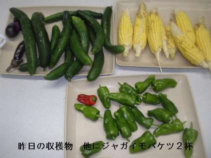 昨日もたくさんの野菜を収穫しました。トウモロコシは最後の収穫になりました。その他の野菜は,まだまだとれそうです。