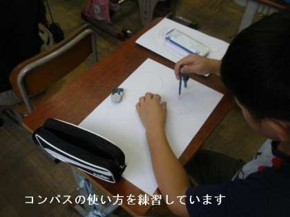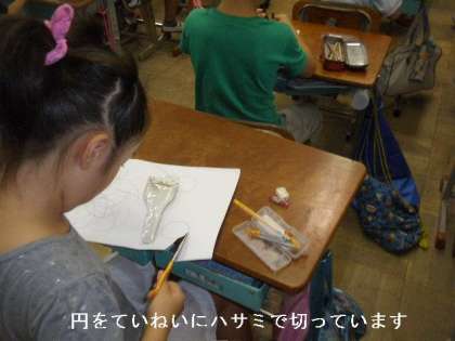 今,算数でコンパスの使い方を勉強しています。今日は,画用紙に円を描いて,その線に沿って切る練習もしました。