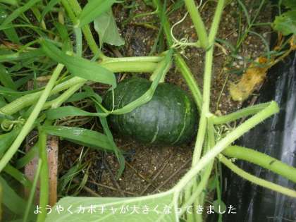 カボチャがようやく大きくなってきました。たくさん結実していたのですが,なかなか大きくならないので心配していましたが,約20センチ大のカボチャが2つできています。もう少し大きく育てて収穫します。