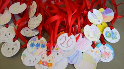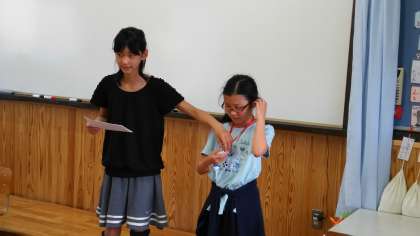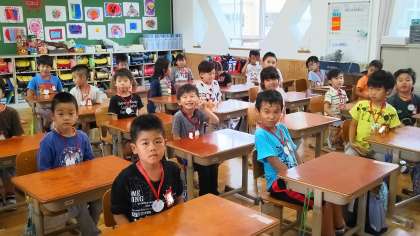 生活向上委員会で手作りしたシャキッとメダルを一年生にプレゼントしました。学習時に姿勢が悪いとメダルが隠れてしまいます。メダルが隠れないよう正しい姿勢を意識して学習していました。