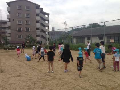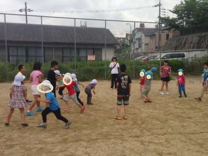 ゆり組さんは公園でドッジボールをしています。園児と5年生の混合チームで対戦です!