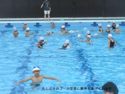 雨上がりの今日,久しぶりにプールに入りました。とても気持ちよく,みんなで歓声を上げて楽しみました。しっかり泳ぎの練習をしたあと,お楽しみの「宝さがし」をしました。