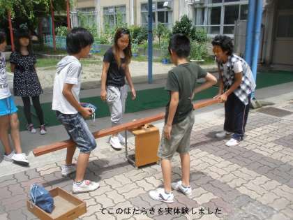 理科で「てこのはたらき」の勉強をしています。今日は,大きなてこを使って実体験してみました。