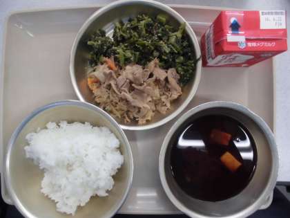 今日の給食の献立は,「ご飯」「赤だし」「牛乳」「豚肉とこんにゃくの炒め煮」「大根葉の胡麻炒め」です。