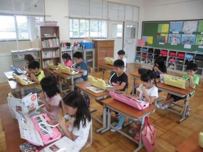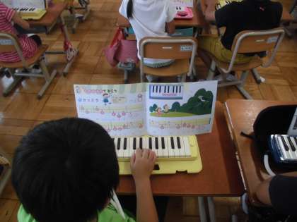 音楽の時間に,「かっこう」を学習しています。「かっこう」をけんばんハーモニカで演奏していました。