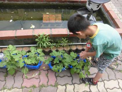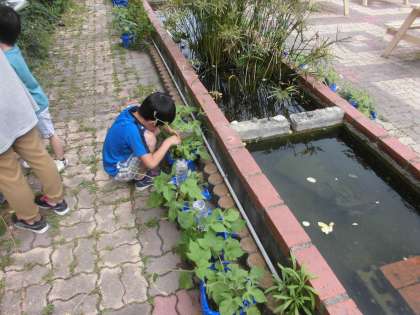 生活科の時間に,あさがおを育てています。しっかりと水やりをしていました。む