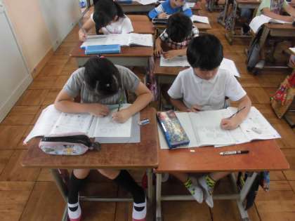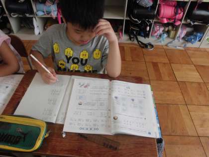 算数の時間に,「たし算」を学習しています。今日は,たし算の筆算の練習問題をしていました。