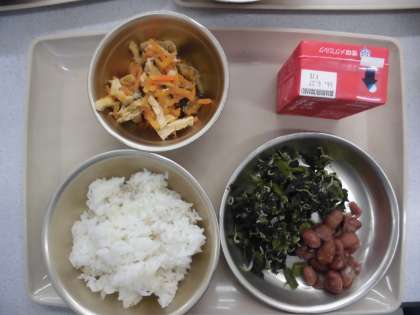 今日の給食の献立は,「麦ご飯」「こぎつねちらしの具」「牛乳」「ほうれん草とじゃこの炒め物」「金時豆の甘煮」です。