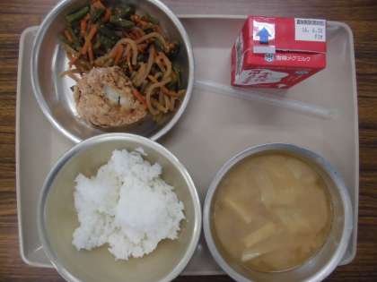 今日の給食の献立は,「ご飯」「味噌汁」「牛乳」「さわらの竜田揚げ」「野菜のきんぴら」です。