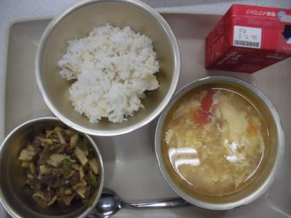 今日の給食の献立は,「玄米ご飯」「トマトとたまごのスープ」「牛乳」「チンジャオロース」です。