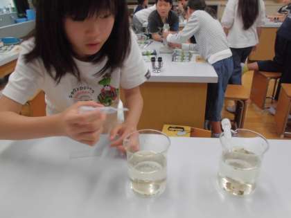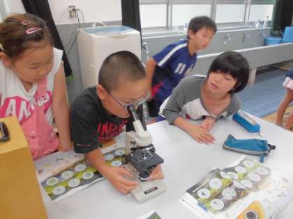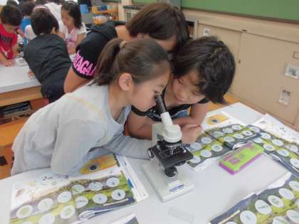 ビオトープの池の中には,どんな微生物がいるのか顕微鏡を使って調べました。「あっ!これボルボックスや!」「これはミドリムシかな?」など,子どもたちは微生物を発見する度に大興奮でした。
