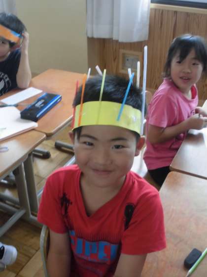 図画工作の時間に,「わっかでへんしん」を学習しています。今日は,作製した作品の発表会をしていました。