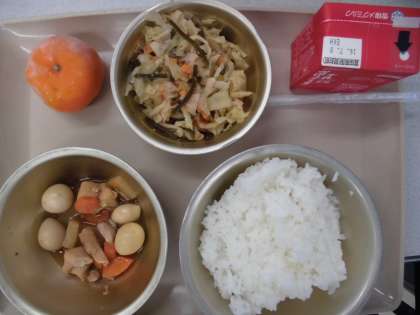 今日の給食の献立は,「ご飯」「こんにゃくの煮付け」「牛乳」「胡麻酢煮」「みかん」です。