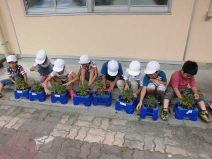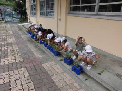 生活科の時間に,「ミニトマト」を栽培しています。今日は,間引きをしていました。
