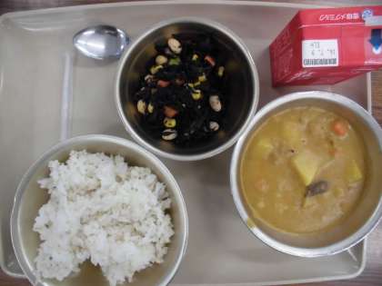 今日の給食の献立は,「麦ご飯」「ポークカレー」「牛乳」「ひじきのソテー」です。