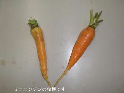 ニンジンは小さいものしか収穫できませんでした。プール横のかたい地面を掘り返して畑をつくった場所だったので,肥料が少なかったことが原因だと思います。でも隣のサツマイモは順調に育っています。
