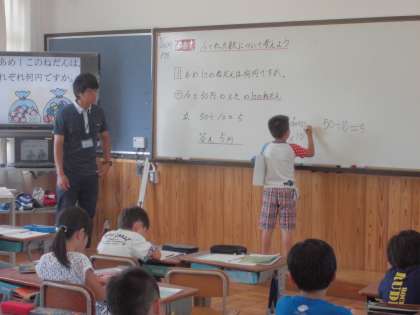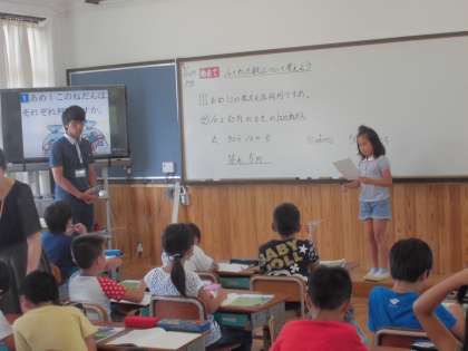 10でわる計算の仕方を考えました。50÷10や250÷10の結果から,なぜ10でわると位が1つ下がり,1の位の0を取った数になるのかを考え,一生懸命説明をしていました。