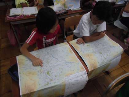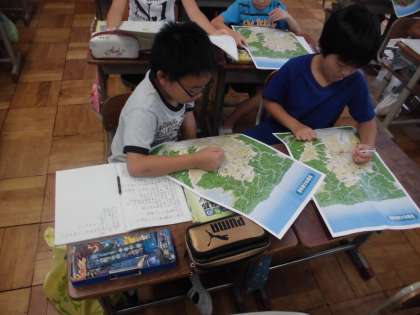 社会の時間に,「京都市」について学習しています。今日は,京都市の様子を地図を使って調べていました。