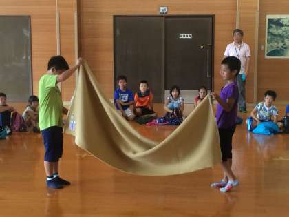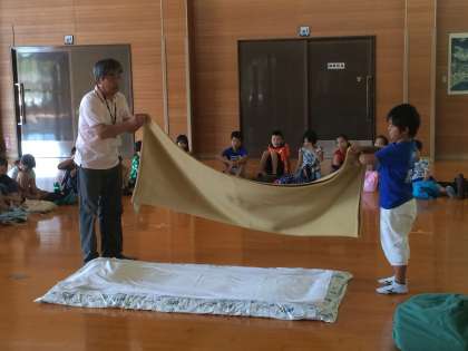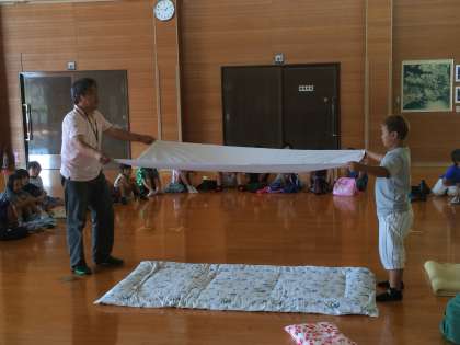シーツは、二人1組できれいにたたみます。来た時よりも、美しく!