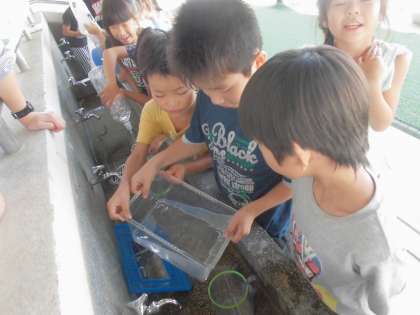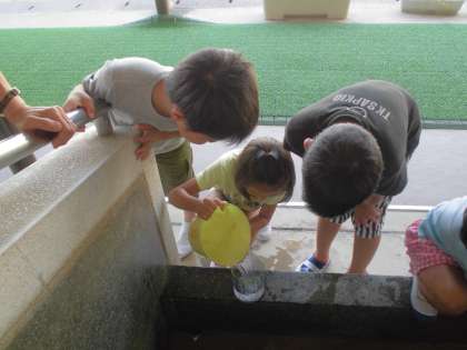 身近な容器使って水1Lを目分量で量りとり,リットルますで確かめる学習をしました。いろいろ試すことで,深さが入れ物によって変わることや1Lの量を実感することができました。