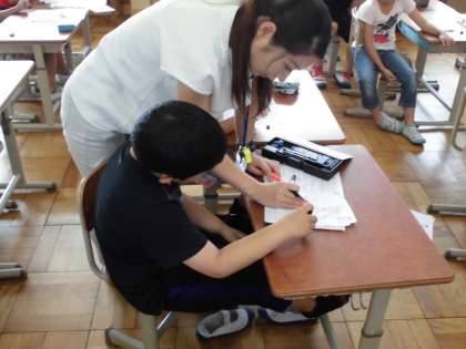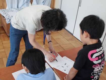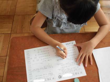 算数の時間に「かさ」の学習をしています。今日は,「かさ」の練習問題をしていました。