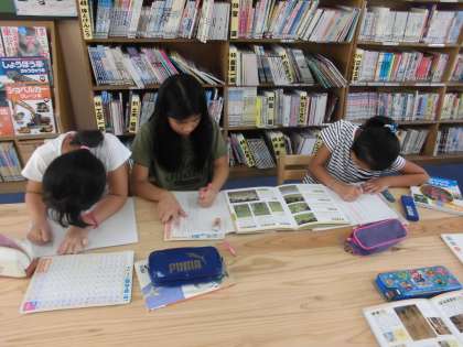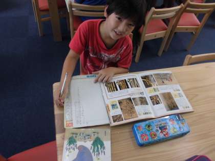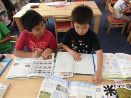 国語の時間に,「本は友だち」を学習しています。今日は,「里」について図書館で調べていました。