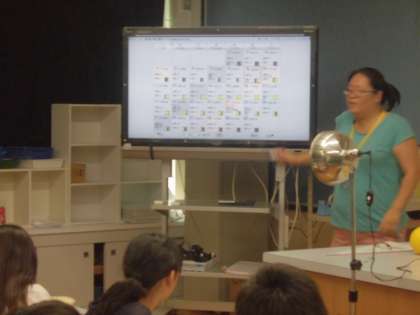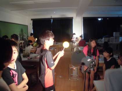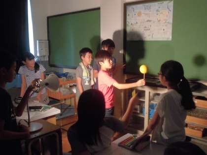 月の形の変わり方を調べる実験をしました。暗くした部屋の中で,ボールに光を当てて,人工の月を作りました。見る方向によって,形がどんなふうに見えるかよく観察し,形をスケッチしながら調べました。