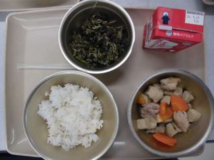 今日の給食の献立は,「麦ご飯」「高野豆腐と野菜の炊き合せ」「牛乳」「ほうれん草ともやしの胡麻煮」です。