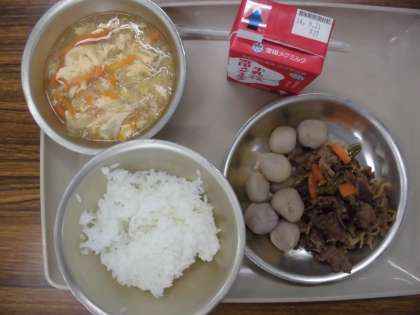 今日の給食の献立は,「ご飯」「キャベツのかきたま汁」「牛乳」「牛肉のしぐれに」「里芋の煮付け」です。