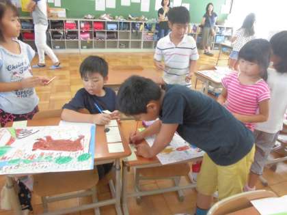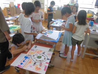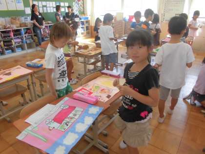 完成したお互いのお話の絵を鑑賞し合いました。たくさん友達のいいところを見つけられたようです。