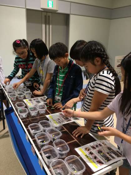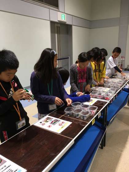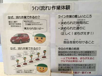 ライン(流れ)作業体験をしています。この活動を通じてライン作業の工夫に気づいてほしいです。