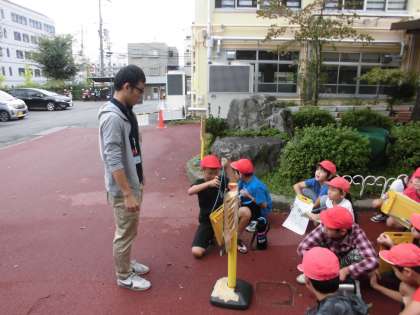社会の時間に,「安全なくらしを守る」を学習しています。今日は,校区内の防火設備を調べに行きました。