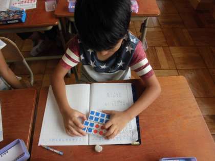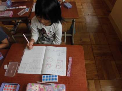 算数の時間に,「ふえたりへったり」を学習しています。今日は,たし算の仕方を学習していました。