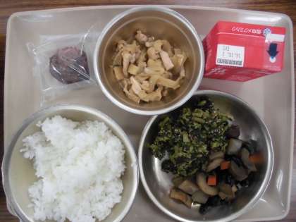 今日の給食の献立は,「ご飯」「きつね丼の具」「牛乳」「黒豆の五目煮」「大根の胡麻炒め」「おはぎ」です。
