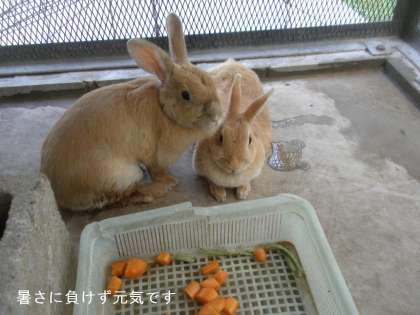 今日も猛暑が続くようですね。早朝,涼しい時にウサギ小屋を掃除しました。でも,鉄板の屋根でできたウサギ小屋の中は,8時現在で40度近くあります。直射日光を「よしず」で遮っていますが,風通しも悪く大変な暑さです。中に入ってそうじをするだけで全身ビッショリの汗です。掃除後には着替えをしなければなりません。そんなウサギ小屋ですが,ウサギたちは暑さに負けず,食欲もあり元気に過ごしています。掃除の度に,外に出してやっていますが,ウサギたちもそれが毎日楽しみのようです。
