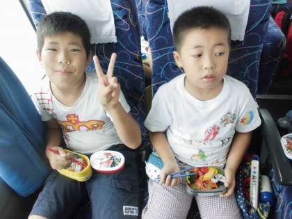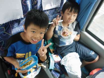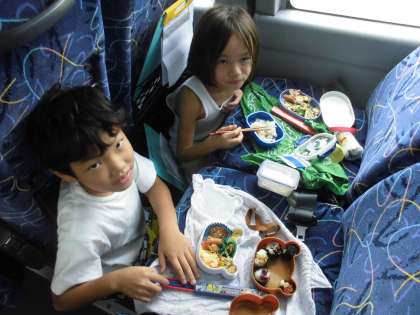午前中の工場見学時間が延びたので,バスで昼ご飯を食べることになりました。