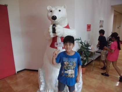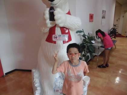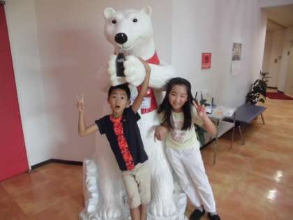 マスコットの前で,「ハイチーズ」