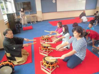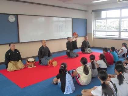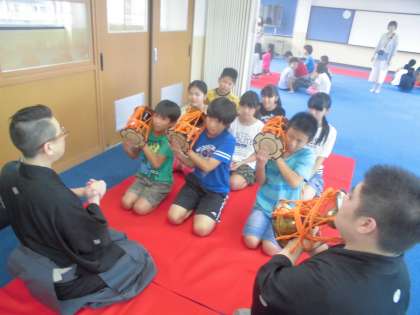 能楽体験をさせていただきました。能楽の楽器に実際に触れることができ,子どもたちは大喜びでした。
